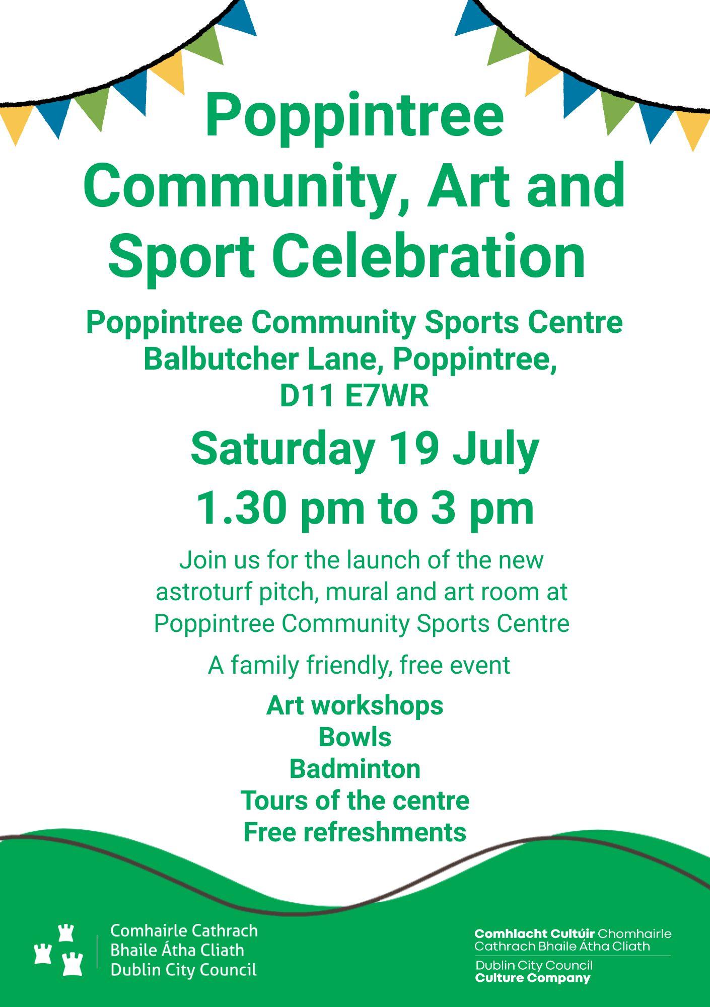 At Poppintree Community Sports Centre, Dublin 11 a new mural, new art room and new astro turf pitch was launched at the Community Art and Sport Launch on Saturday 19 July with visual artist in residence Mark Joyce. Visitors were able to try out art workshops, have a go at badminton and bowls, and take a tour of your community sports centre. Thanks to all the Councillors, especially Cllr Alison Fields representing the Lord Mayor of Dublin, Centre staff, performers and members of the community who came along on the day.